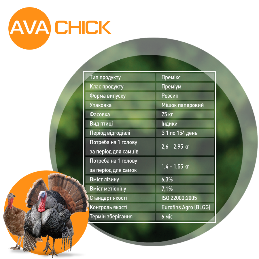 Премікс, який призначений для приготування комбікорму для індиків протягом усього періоду відгодівлі з 1 дня і до забою. Норма введення в комбікорм становить 5%. Премікс AVA CHICK MIX 5% можна використовувати для курчат-бройлерів, водоплавної птиці та перепелів сучасних кросів та порід впродовж усього періоду вирощування на м’ясо.